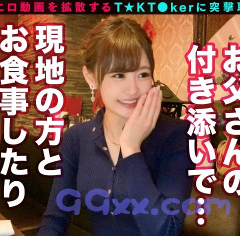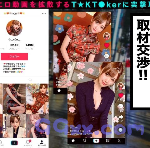 T☆kTokでエッチな動画を投稿するエロ可愛い女にDM(ダイレクトメッセージ)で連絡を取り、その場のノリでしれ~っとSEXまでしちゃおうという、次世代ナンパ企画!(1) 事前にスタッフが連絡を取り渋谷区道玄坂で待ち合わせた、今回のT☆kT●kerは「ノノ」ちゃん(25歳)!なんと彼女のお父さんは世界各地で何店もの中華料理店を経営している大企業の社長さん!とてつもない大金持ちの激かわ社長令嬢だ。(2)待ち合わせた場所の近くに彼女のお父さんが経営をしているお店があるということでそこでお酒を飲みながら色々とお話しを聞くことに!彼女は日頃からお父さんの付き添いで世界各地をまわり、T☆kT●kで少しエッチな動画をアップしているそうだ。そんなことをしているせいか各国のフォロワーからDMが届くこともしばしば、好みの男はそのままエッチまでしてしちゃうと意外と肉食系だ!お酒も手伝いドンドンエッチな話題に花が咲くと、彼女もエッチな気分になってきたのかボディタッチが増えあげく店内でキスまでしてしまう。すると彼女の方から「我慢できなくなったからホテル行きましょう」と可愛い顔でお誘いが!据え膳食わぬはということでそのままホテルへGO!(3)ホテルへ 到着した途端、濃密に唇をあわせ体をまさぐる、服を脱がして乳首をさわると「気持ちいい」声をあげながら可愛く感じるノノちゃん。下着越しにおマ○コを触ってみるとすでに濡れていてマン汁がたっぷりの様子。指マンするとピチャピチャ音をたてながら敏感にあえいでいました。そんなノノちゃんにチ○ポを差し出すと満面の笑みでお口に含み奥までジュポジュポ音をたて、男の顔を見ながらしゃぶるノノちゃん。「もう挿れたい♪」と我慢ができなくなった彼女は騎乗位の状態で自ら生チ○ポを挿入!自由自在に腰を振りまくり「すごいィィ、気持ちィィ」とイキまくる!!あまりの刺激におマ○コがバカになったのかピュッピュと何度もハメ潮を出しまくる!責め上手な彼女の腰つきにこちらも我慢ができず中出し2連発!! (4)彼女が普段から着ているチャイナドレスに着替え3回戦突入!まさかのノーブラ&ノーパン&網タイツとエロイにもほどがあるコスチュームに2回も出して萎えていたチ○ポも再び完全に勃起!網タイツ越しに生チ○ポを挿入すると、さっきより更に激しく突きまくる超ハードSEX!!カメラを見つめ感じるハメ顔さえも可愛い、まさに最高のオカズ美少女ノノちゃんでした♪