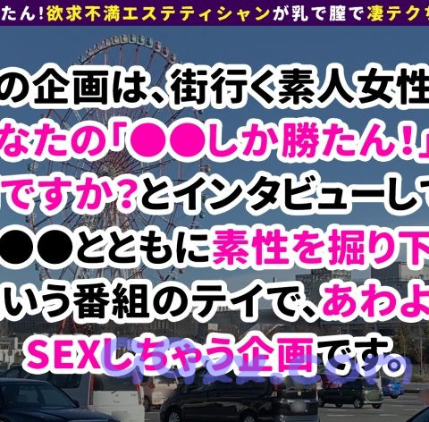 インタビューを通して、【○○しか勝たん!!】とともに素性やエッチな体験談を掘り下げるという企画です!ヤリマンな本性を全開にさらけ出してもらいつつ、じっくりと女の子の美BODYを味わっちゃいましょう♪今回出会ったほのかちゃんは「お台場しか勝たん!」ということで、お台場デートをすることになりました♪レトロな雰囲気のゲームセンターへ到着。ホッケーを遊んだりして満喫しました!打ち解けてきたところで、色々と突っ込んだお話をしていると…なかなかのエッチなお姉さんであることが判明!それなら話が早いですね!ホテルへ任意同行してもらいますw到着した瞬間、即フェラ!自慢の長い舌でチ●コを絡みとってきます!足先まで舐められ、射精寸前w今度はこちらから責めます。ドデカイおっぱいを揉み、手マン、クンニで敏感マ●コがビシャビシャ!!「もう我慢出来ない」と挿入!ソファで騎乗位からの立ちバック!ベッドへ行かずに中出ししちゃいましたwまだまだヤリ足りないので、エロコスに着替えて二回戦!!ベッドでパイズリフェラ!チ●コも完全復活です!!!そのまま騎乗位挿入!揺れるおっぱいを見ながらのピストンは最高ですねw窓際で見せつけ立ちバック!からの騎乗位!!最後はデカチチへぶっかけ射精!お掃除フェラまでしてもらえて、めちゃくちゃ気持ちよかったですw