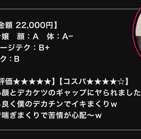 整った可愛い顔とデカケツのギャップがマジどエロかった!!!おしゃべりも打てば響く感じでキャッキャと笑ってくれて終始イイカンジ!プレイ前から当たり確定!!!感度も最高で僕のデカチンで「あぁッ!だめッ!だめぇッ!」とイキまくりの喘ぎまくりで近所からの苦情が心配過ぎます!!!