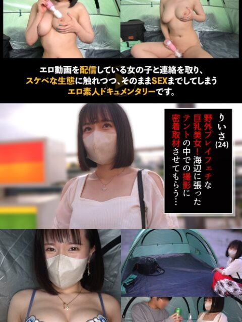あらすじ:エロ動画を配信している女の子と連絡を取り、その動画やその生態に触れつつ、そのままSEXまでしてしまうエロ素人ドキュメンタリーです。今回はriisaさんが登場!ブライダルスタッフなのに、打ち合わせで来た旦那さんを食べちゃうほどの性欲の強さ!これは期待できるwまずは海辺のテントでエロ動画撮影!Gカップパイズリでがっつり抜かれちゃいましたが、本番はここから!ホテルに移動して続きを楽しんじゃいます♪…