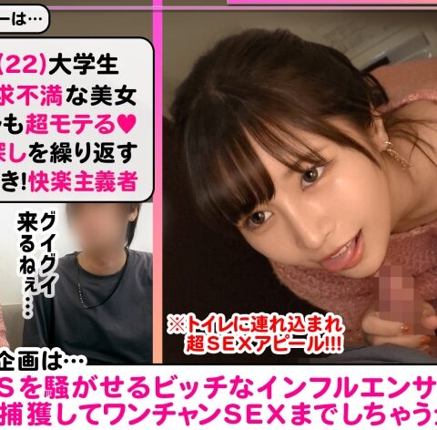 あらすじ:SNSを駆使してヤリまくるビッチなインフルエンサーをDMで捕獲して隙あらばワンチャンSEXまで狙う新時代プロジェクト!今回のヤリモクインフルエンサーは、男をムラッとさせる天才ミナミちゃん(22)狙った男にはすぐ急接近!!上級モテテクを駆使してトイレに誘い込み…