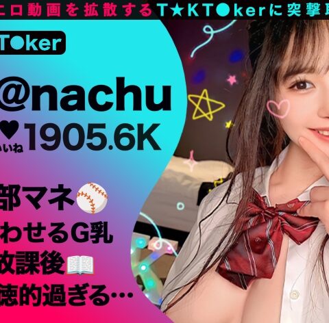 あらすじ:T☆kTokでエッチな動画を投稿するエロ可愛い女にDM(ダイレクトメッセージ)で連絡を取り、その場のノリでしれ~っとSEXまでしちゃおうという、次世代ナンパ企画!!今回のT☆kT●kerは制服越しでは隠れていない!天然G乳女子●生なちゅちゃん(1●歳)!宮●パークで動画を撮影中だった彼女と合流した後、早速インタビューを開始!!マネージャーをしていた野球部をモテすぎて壊滅させた過去を持つ彼女…今は新たな出会いを求めいるようなので、今回はイケメンとの疑似デートをご用意!!デート中オッパイを触らせてくれたり、更にキスまでしちゃうノリノリ彼女とホテルへ直行♪♪ぷるんッぷるんのG乳オッパイで生パイズリ!若さ溢れるパイパンおマ●コに生挿入…その後はエロくて生々しいセックスをたっぷり堪能!オール中出し3連発!