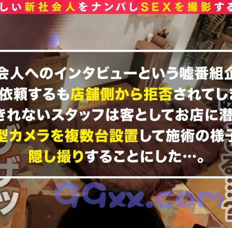 この企画は初々しい女性新入社員をナンパ!ひよっこ新入社員のフレッシュなカラダをいただいて社会の厳しさを教えちゃおうという企画!!今回ターゲットとなったのは銀座のど真ん中でチラシ配りをしていた新人エステティシャン、ミユウちゃん!早速インタビューのお願いしてみると「店長に聞いてみないと分からない」ということでとりあえずお店の方へ行きエステを体験してみることに!お店に到着して彼女が撮影の確認をしている間に勝手に盗撮用カメラを設置完了」!マッサージを受けることに!マッサージは勿論気持ちいいのだがかなり密着型のエステのせいか柔らかい女体が当てられ、こちらのイチモツもドンドン大きくなってしまう、それに気づいた彼女はなんとそのイチモツ手に取り卑猥な手付きでシゴキ上げる!あまりの気持ちよさに瞬く間に射精してしまったスタッフそのまま彼女の体に手を伸ばすが「それはダメ♪」とNGが入り敢え無く断念、本日はここまで、後日、スゴテクナンパ師を呼びどうにか本番撮影してもらうようにお願いしてお店に潜入してもらうことに、この前と同じくチ○ポを集中的にマッサージしてくれる彼女に対しこちら言葉巧みに彼女の体もマッサージしてあげることに成功!心なしか彼女の方も息が荒くなり、これはワンチャンあるかもと彼女を抱き寄せ濃密ベロチュウ炸裂!彼女も自分から舌を出し男と激しく舌を絡ませ合う!モデル顔負けの超クビレボディーを卑猥に愛撫しながらハメ撮りをお願い!チ○ポが欲しくて堪らない彼女は恥じらいながらも了承!禁止事項の本番行為に突入!シミ一つない美白美尻と肛門を眺めながら挿入、あまりの快感に身体をクネクネ震わせながらイッても止めない追撃ピストンイキ狂う!彼女も負け時とハイレベルなエロテクニックで凄まじい快感をもたらしチ○ポを最高の射精に導く濃密FUCK!!