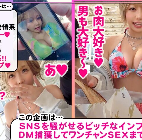 あらすじ:SNSを駆使してヤリまくるビッチなインフルエンサーをDMで捕獲して隙あらばワンチャンSEXまで狙う新時代プロジェクト!今回のヤリモクインフルエンサーは、まおちゃん(26) 「大好物はお肉とオトコ」と豪語する超肉食系のクラブDJ!早速キャンプ場に向かい高級和牛でバーベキュー!テンショングン上がりのまおちゃんはその場で出会った男のトイレに突入して肉棒パックンチョ!あれよ、あれよと射精に誘いオッパイにぶっかけ!その後も別の男達とテント内で乱交SEX!とんでもない潮吹き体質のまおちゃんは少し弄っただけで吹くわ吹くわの大大スプラッシュ!!ホテルに移動しても潮出っ放し!!身体、部屋、カメラ何もかも潮でびしょ濡れにしてくれちゃいました♪