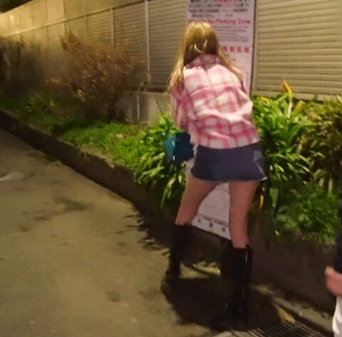 ミニスカートからすらっと伸びる脚の奥には、鮮やかなピンク色の下着が覗いていた。