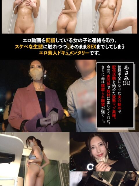 あらすじ:エロ動画を配信している女の子と連絡を取り、その動画やその生態に触れつつ、そのままSEXまでしてしまうエロ素人ドキュメンタリーです。待ち合わせをしていたasamiさんは夫婦で登場!NTR趣味の旦那さんの前でハメて欲しいようです!お望み通り、たっぷりハメちゃいましょう♪…